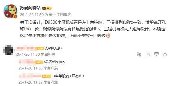 随后,该博主再次曝光了这款新机的部分外观参数和影像参数。据其称,“关于ID设计,D9500小屏机后置是左上角镜组,三摄排列和Pro一致,潜望镜开孔和Pro一致,疑似疑似疑似有长焦微距的HP5,工程机有横向大矩阵设计,不确定落地是小方块还是大矩阵,正面还是极窄四等边”。结合两条微博评论区网友的评价该机大概率就是此前传闻的OPPO Find X9s。