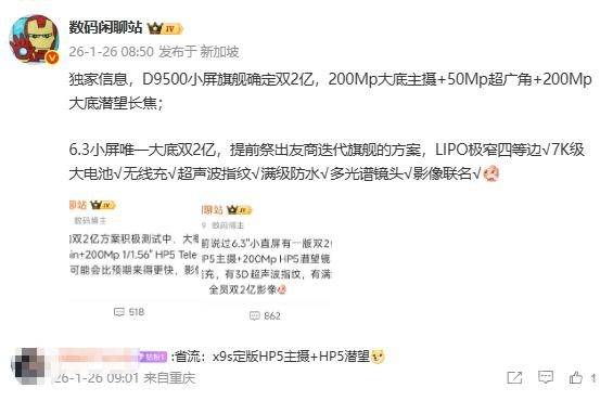 日前,数码博主“数码闲聊站”再次曝出独家信息,据其称,这款新机是一款“D9500小屏旗舰确定双2亿,200Mp大底主摄+50Mp超广角+200Mp大底潜望长焦;6.3小屏唯一大底双2亿,提前祭出友商迭代旗舰的方案,LIPO极窄四等边√7K级大电池√无线充√超声波指纹√满级防水√多光谱镜头√影像联名√”。