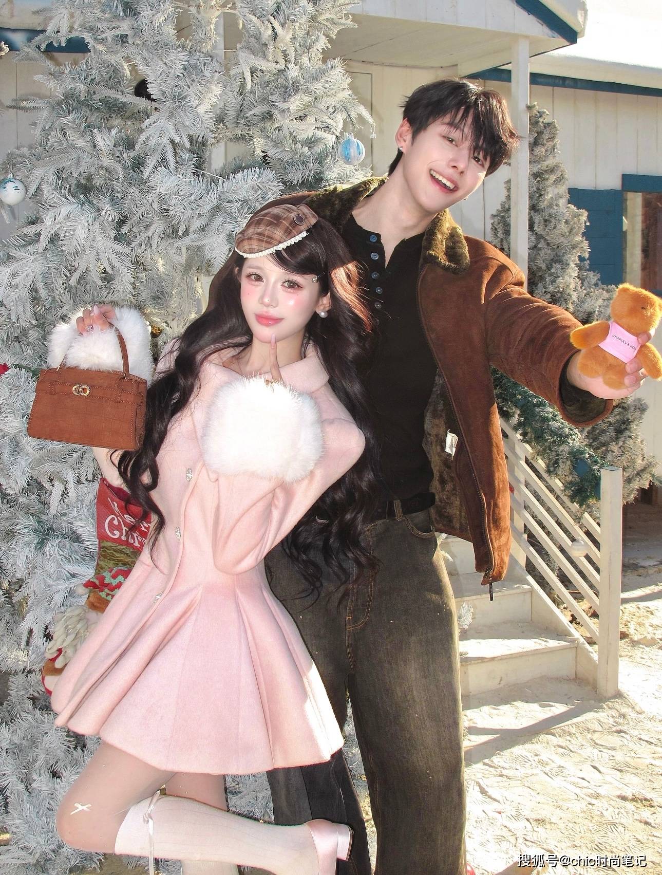 如果不喜欢带着节日氛围的红色,粉色系也是不错的选择,粉色连衣裙自带娇俏和温柔,搭配男生的棕色系麂皮外套穿搭,把温柔少女和松弛少年浪漫融合。