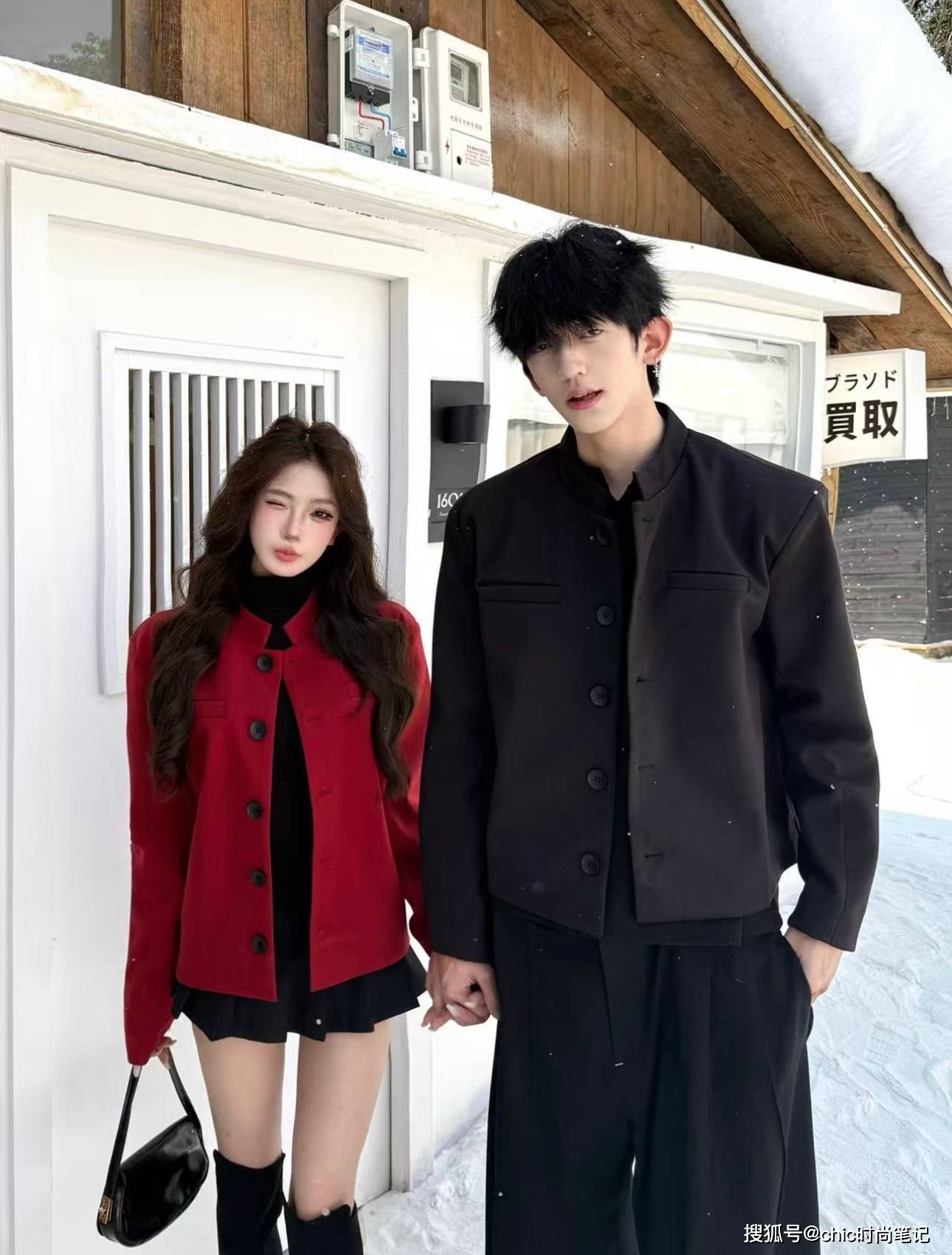 女生选择红色外套搭配黑色短裙,男生则选择同面料但不同颜色的外套与之搭配,黑色外套自带帅气,搭配黑色休闲裤后把时尚度拉满。