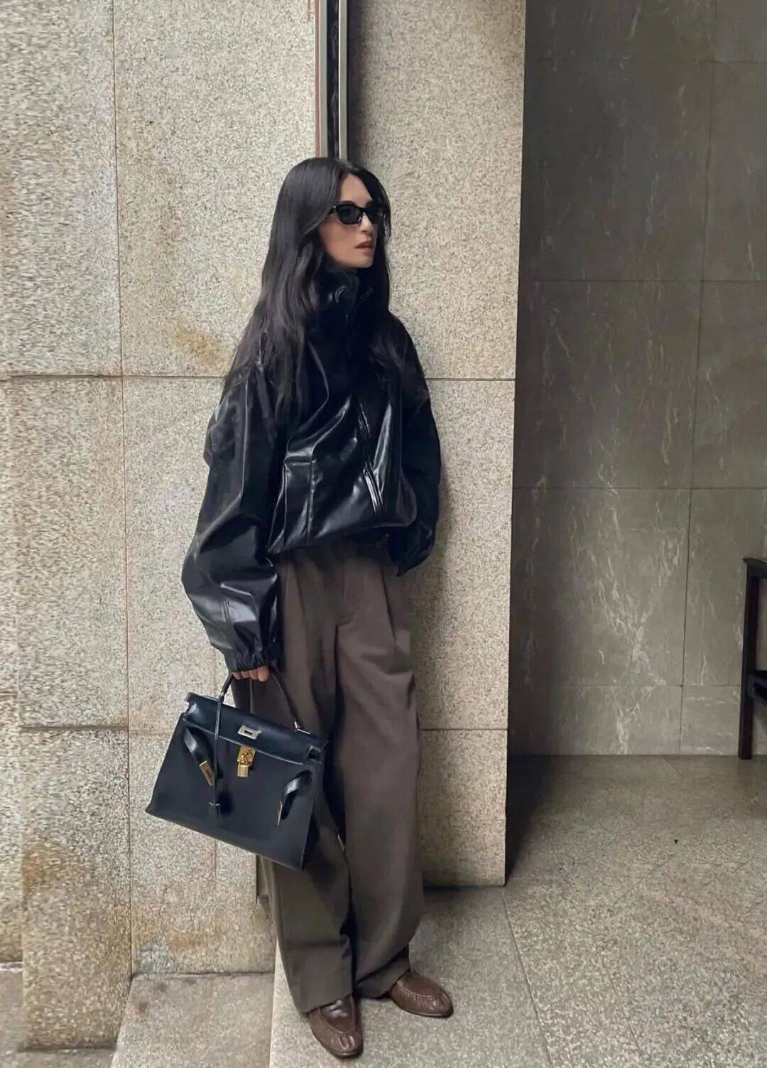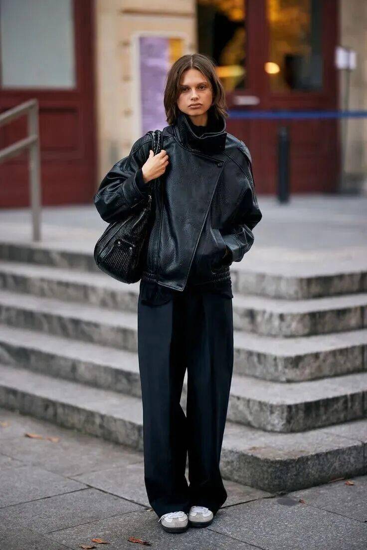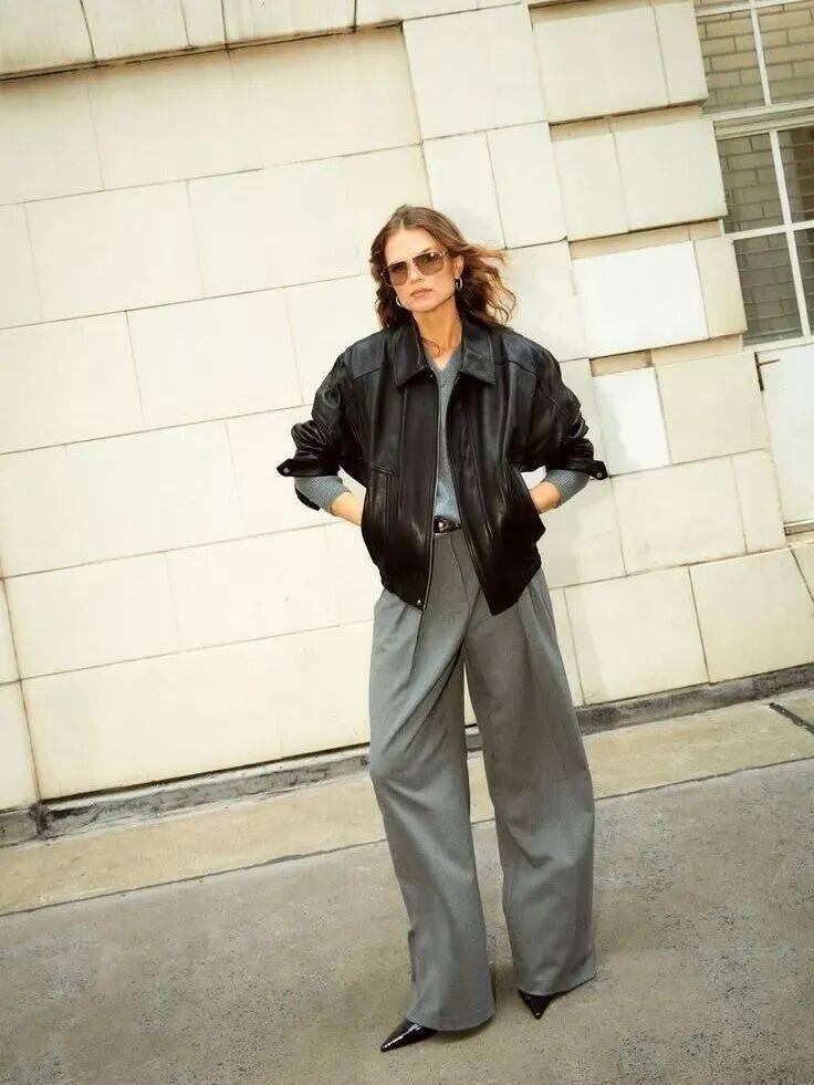 1. 皮夹克 × 西装阔腿裤:利落飒爽,职场气场全开