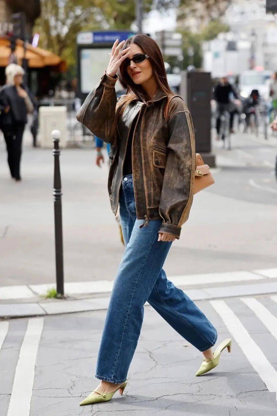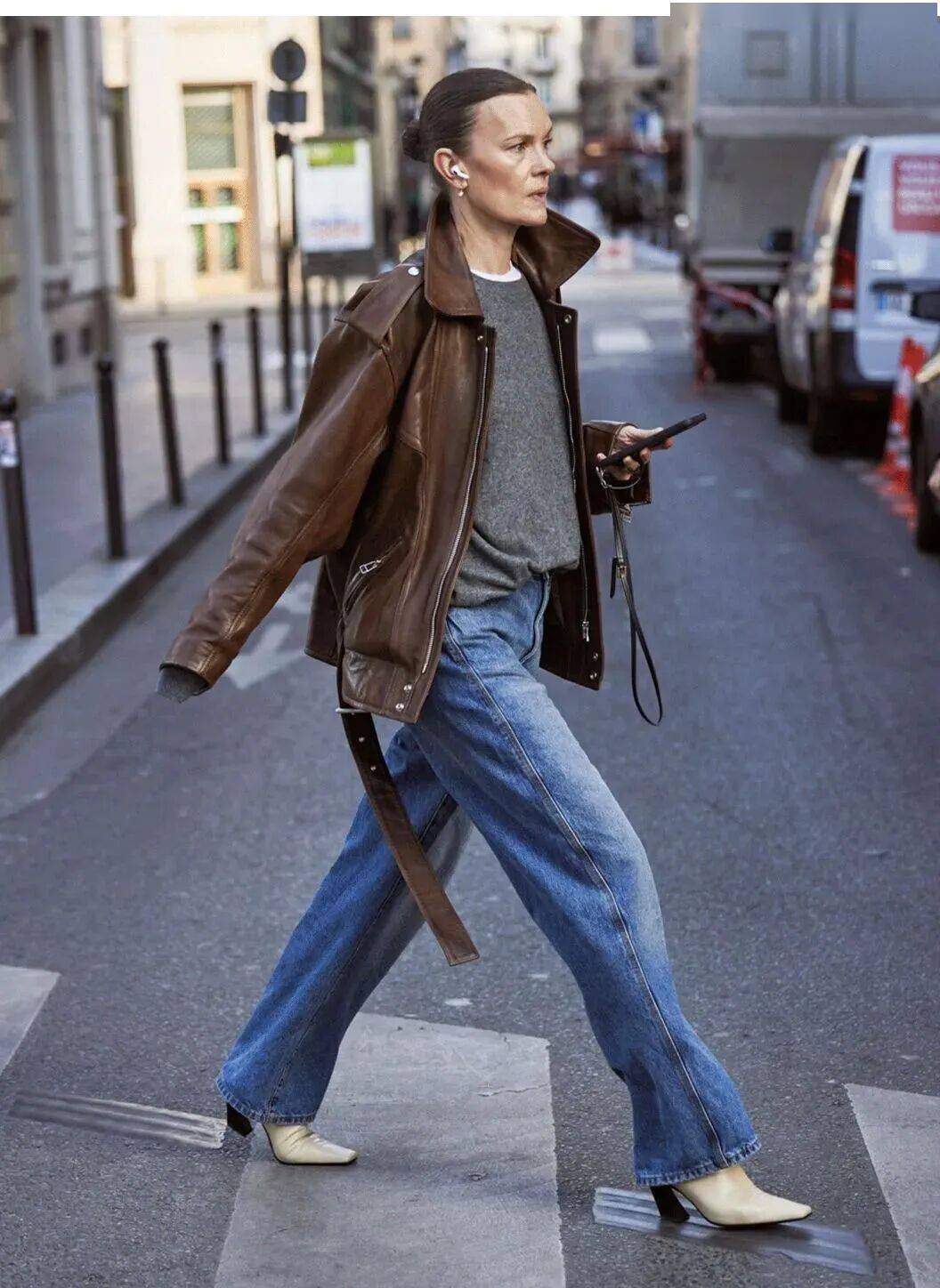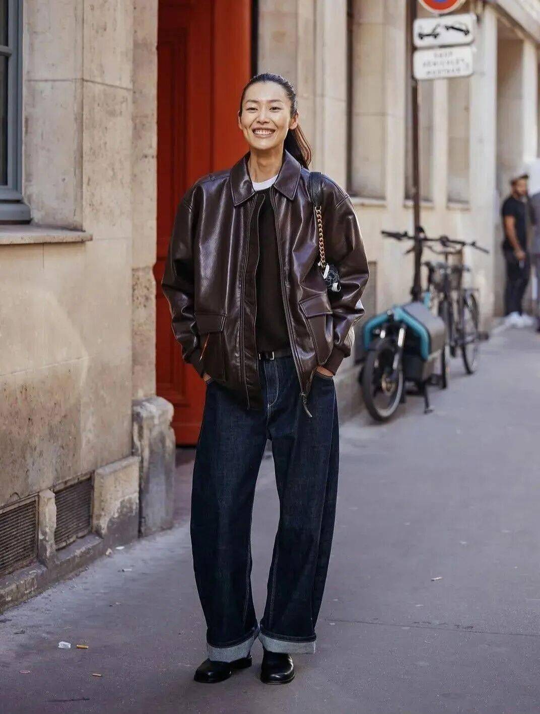 3. 皮夹克 × 牛仔阔腿裤:复古浪漫,塑造秋冬氛围感