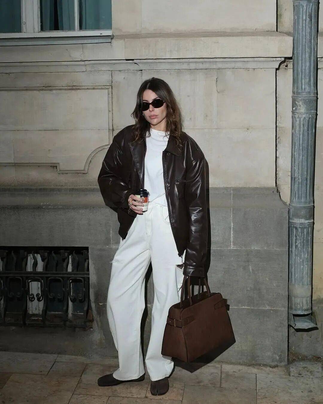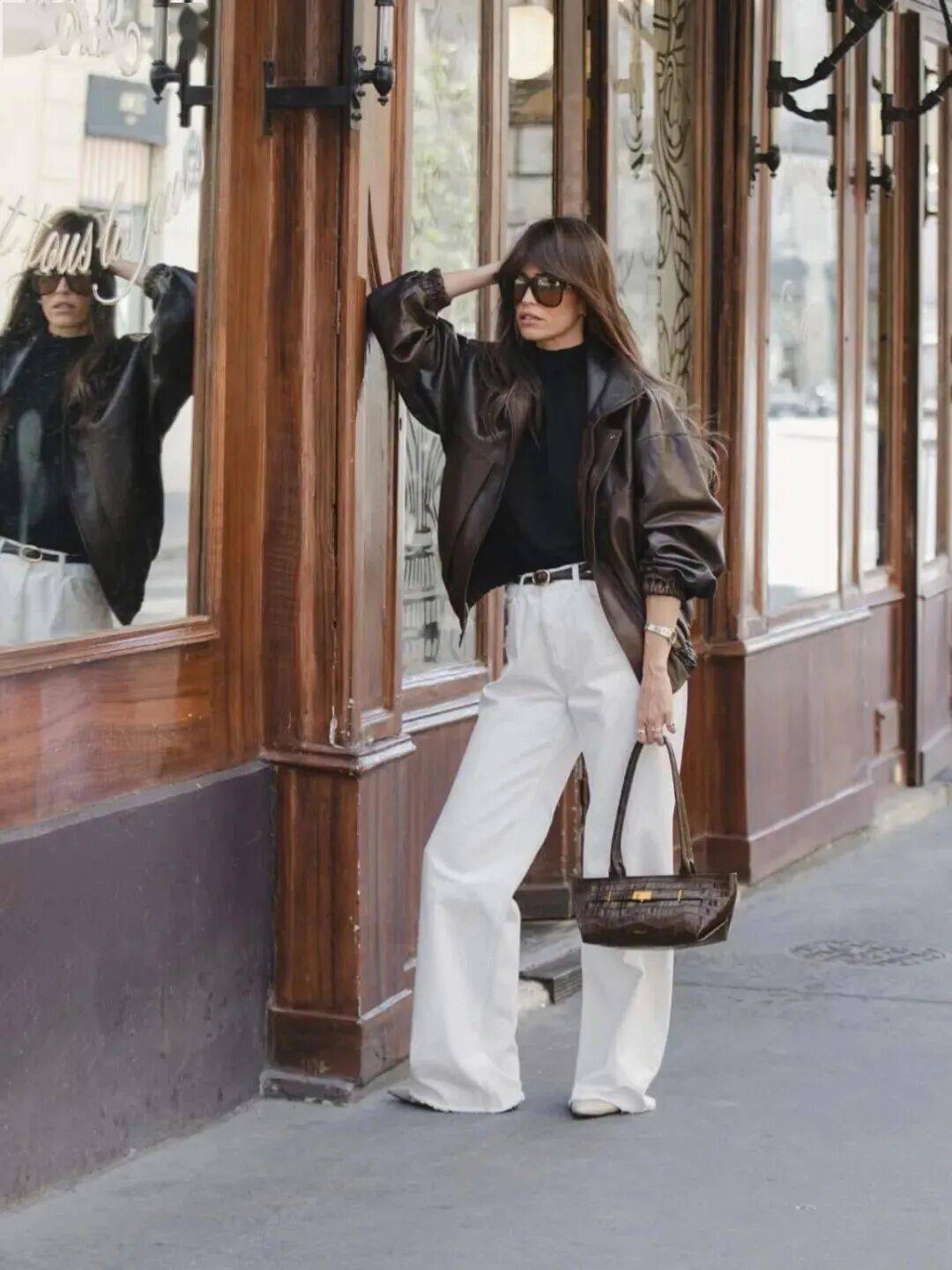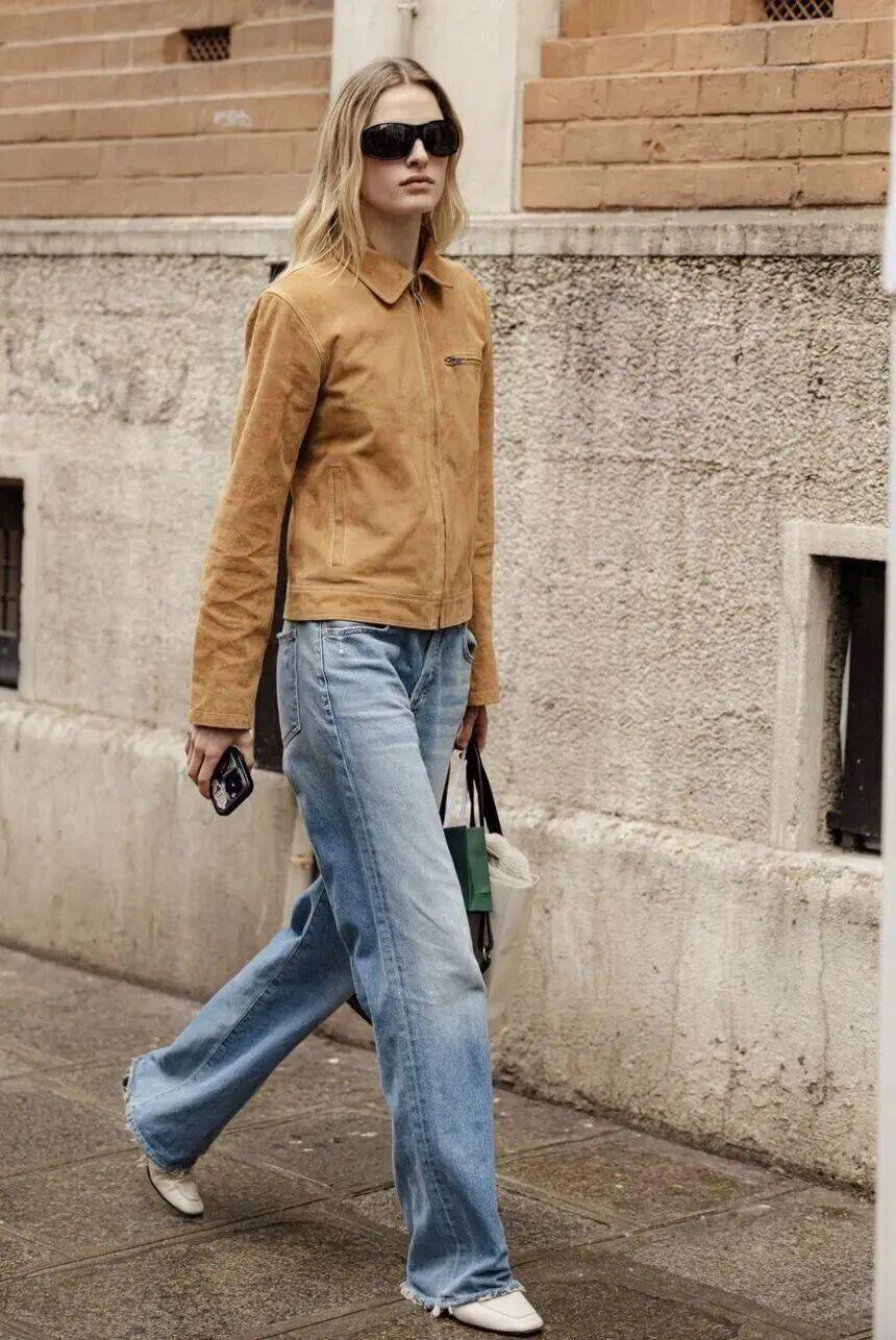 牛仔阔腿裤自带经典标签,不挑腿型、包容万千,与皮夹克的搭配更是复古味十足。尤其是暖咖色皮衣搭配牛仔蓝,仿佛瞬间穿越至80年代的巴黎街头,慵懒而浪漫,秋冬氛围感直接拉满。