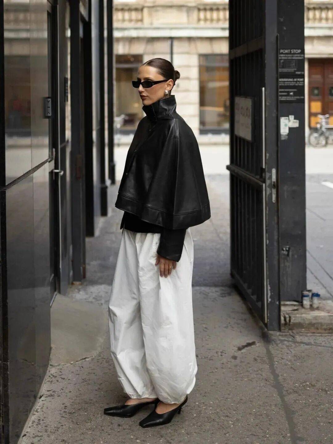 若觉得深色系过于严肃,不妨以白色阔腿裤提亮整体。清新明亮的色调能巧妙中和皮衣的沉闷,为造型注入呼吸感。一黑一白,对比鲜明,既是经典的延续,也是时髦的表达,历久弥新,永不过时。