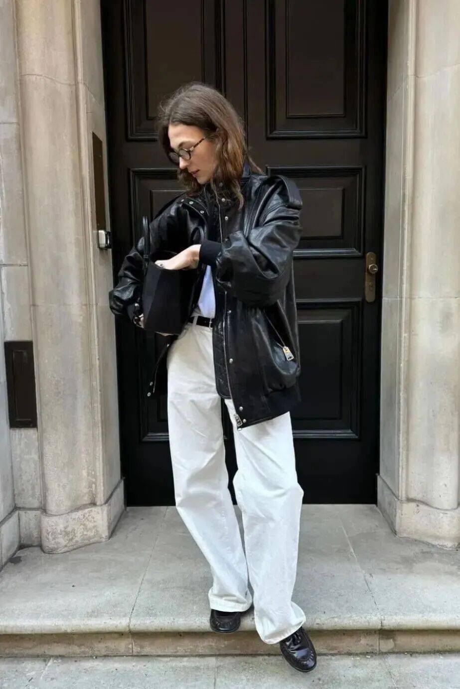 2. 皮夹克 × 白色阔腿裤:清新减龄,黑白永恒经典