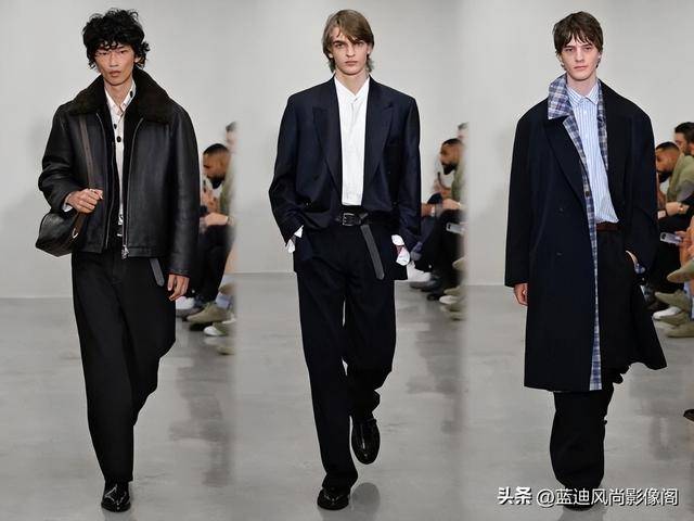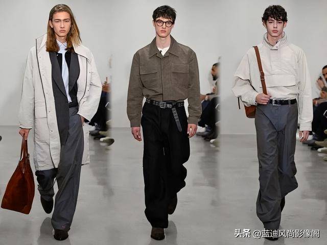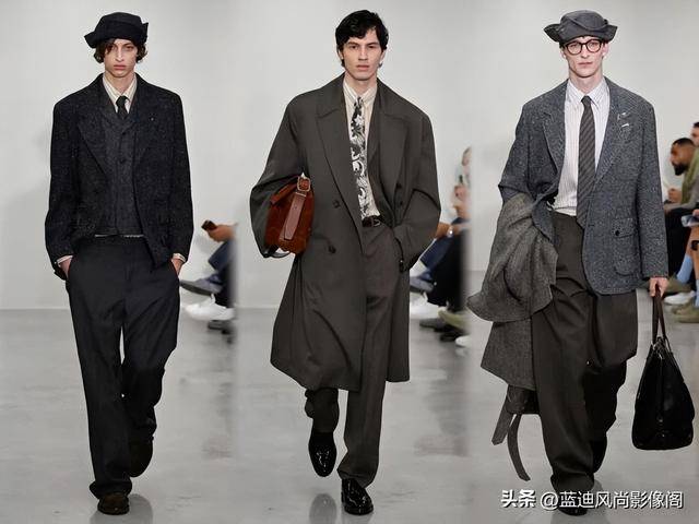 还有件深灰色休闲西装更绝!不是正装那种硬挺的料,是带点垂感的软面料,搭了件浅灰色基础 T,领口松松垮垮的,下装是卡其色直筒裤,裤脚刚好盖过鞋面。模特走在模拟的街头场景里,风把西装下摆吹得轻轻晃,没有刻意挺胸抬头,反而有点漫不经心的松弛 —— 我当时就想,这不就是我理想中的通勤装吗?不用费劲想搭配,穿去开会不违和,下班约朋友吃饭也不用换衣服,一件顶三件用!